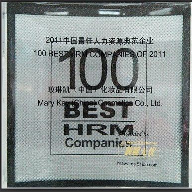 2011年12月9日,“2011中国最佳人力资源典范企业颁奖礼”在上海隆重举行,玫琳凯中国荣登“2011最佳100家人力资源典范企业”榜单,这已是玫琳凯中国连续第三年上榜此榜单。在颁奖礼上,玫琳凯中国还被授予“最适合女性工作场所典范企业”的荣誉奖项。