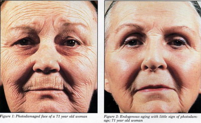 这张图片同是71岁的双胞胎老人但肤质相差甚远,左边的妹妹一直生活在农村务农,每天接触大量的紫外线,而右边的姐姐一直生活在城市,接触不多也不强烈的紫外线。