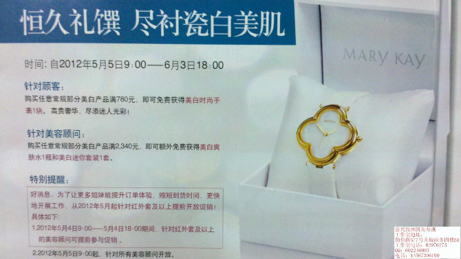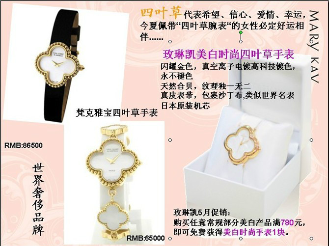 针对顾客:购买任意常规部分美白产品满780元,即可免费获得美白时尚手表一块。高贵奢华,尽添迷人光彩!